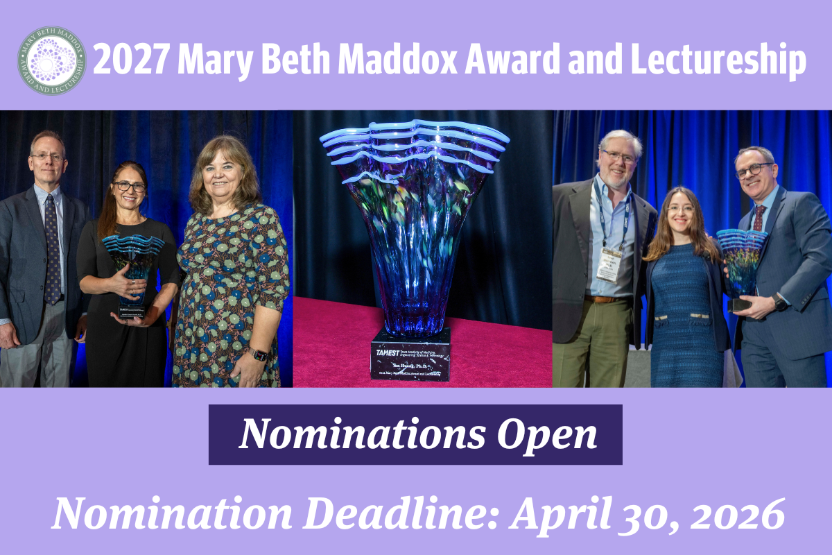 Nominations for the 2027 Mary Beth Maddox Award and Lectureship are open through Thursday, April 30, 2026, at 6 p.m. CT. The Mary Beth Maddox Award and Lectureship recognizes early career women scientists in Texas bringing new ideas and innovations to the fight against cancer. The recipient will be honored at the TAMEST 2027 Annual Conference, where they will present their research to attendees and receive a $5,000 honorarium and award. The recipient will also promote their work and discoveries across the state at established lecture and seminar series at TAMEST member institutions with NIH National Cancer Institute Designated Cancer Centers.